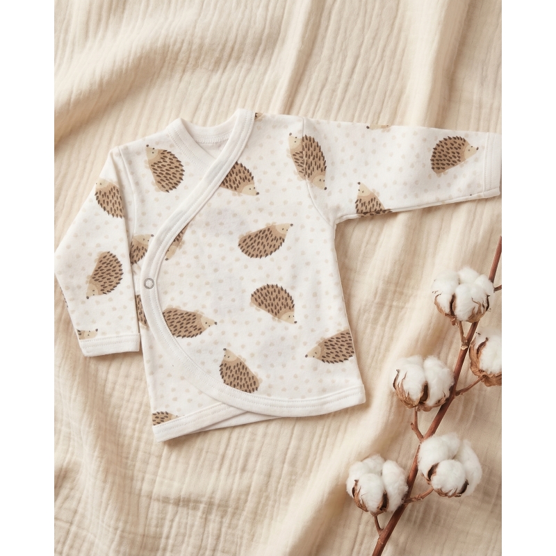 Zapinanie kopertowe: Specjalny sposób zapinania pozwala na szybkie i łatwe zakładanie oraz zdejmowanie koszulki niemowlęcej, co jest szczególnie przydatne podczas codziennych zmian ubrania i pielęgnacji maluszka.
