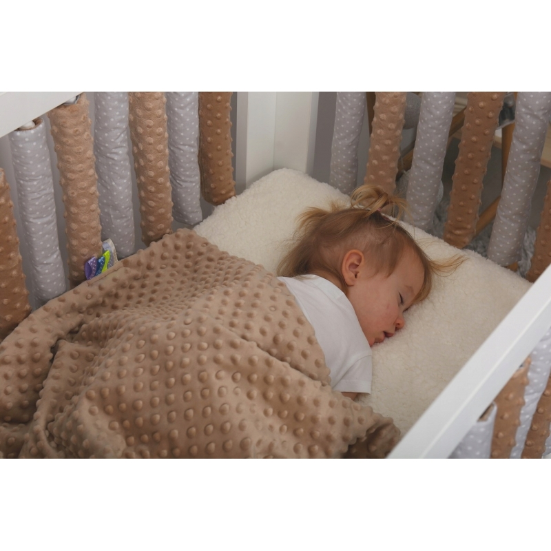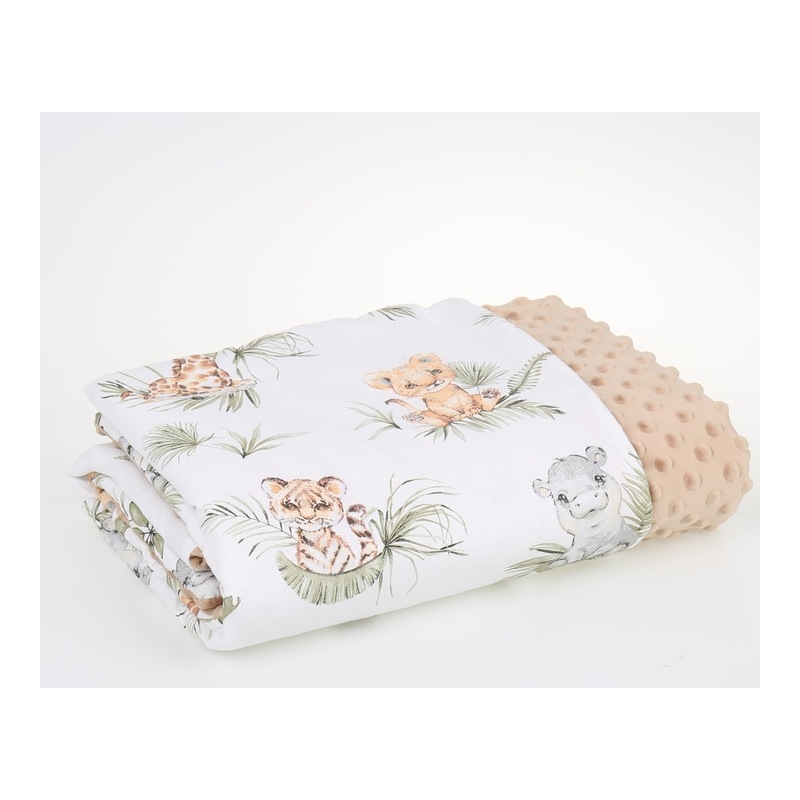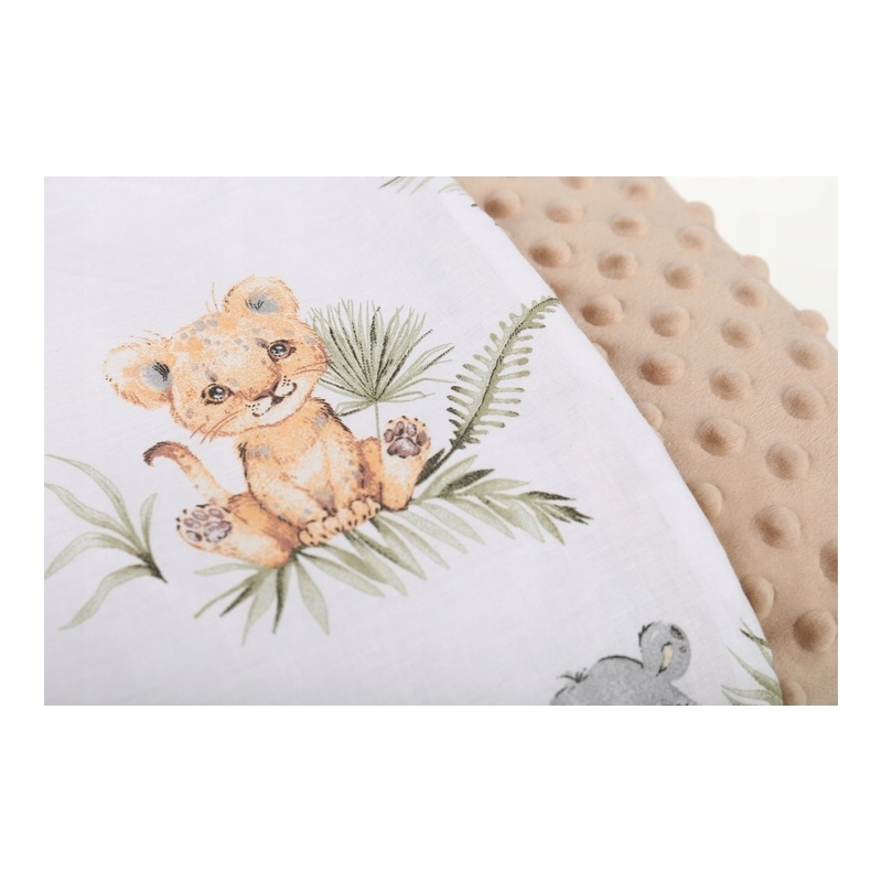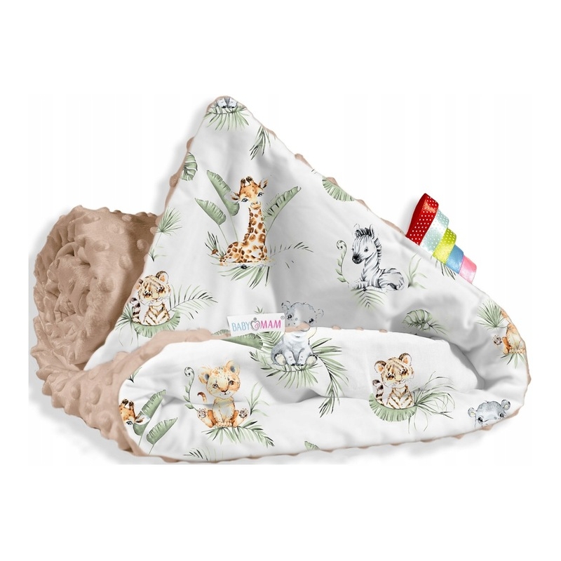 Z jednej strony kocyka znajdziesz przyjemny w dotyku polar minky, który zapewnia ciepło i miękkość, idealne do przytulania się w chłodniejsze dni. Z drugiej strony zastosowaliśmy dzianinę bawełnianą 100% z nadrukiem, który nie tylko dodaje charakteru, ale także jest delikatny dla wrażliwej skóry dziecka.